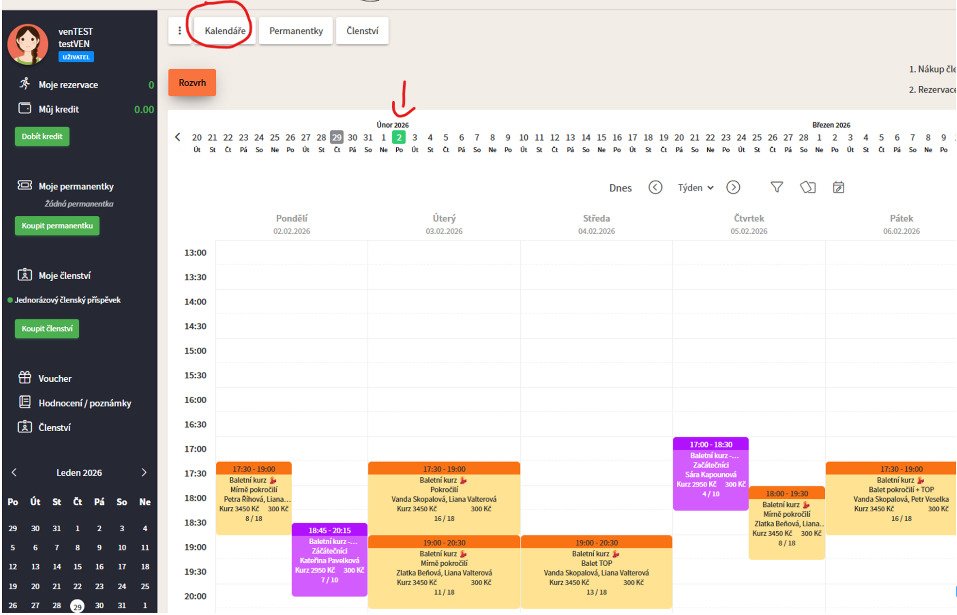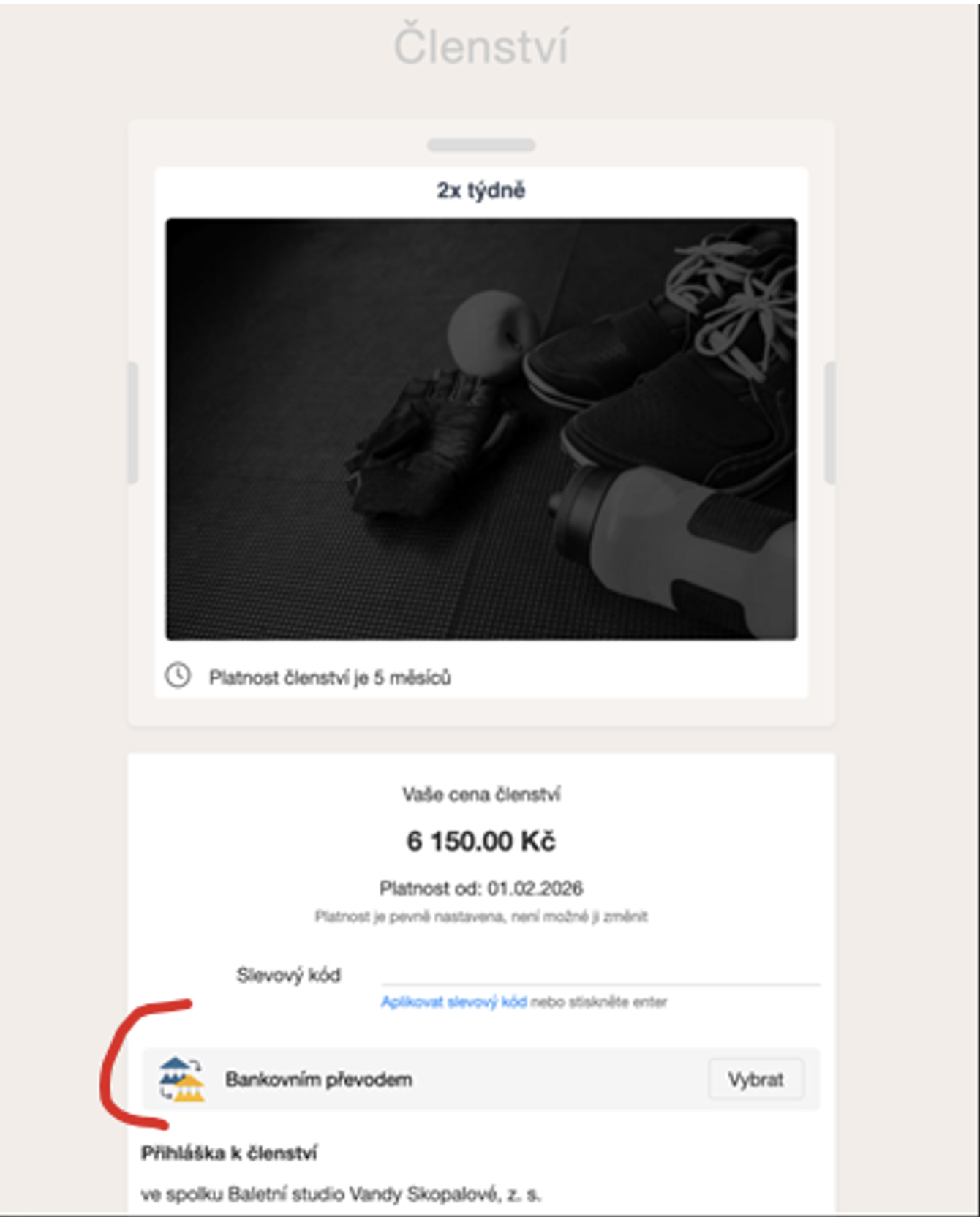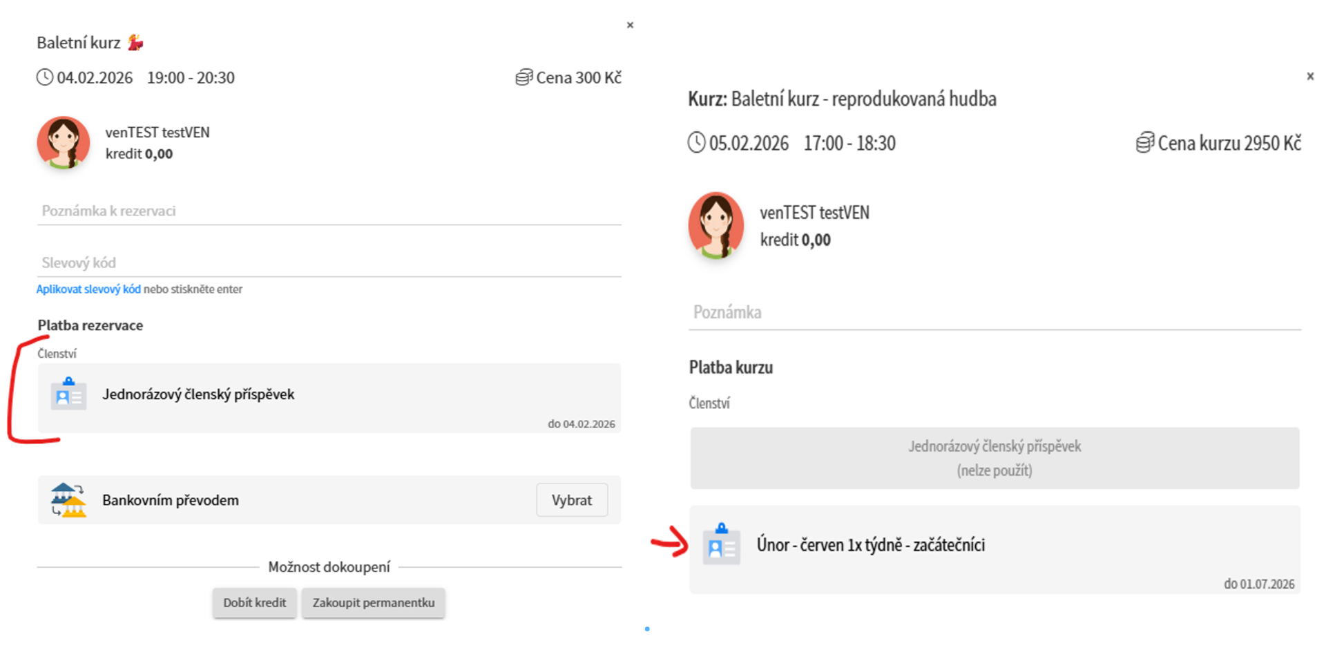 Celý kurz / lekci zaplatíte uhrazeným členstvím (uhrazeným v bodě 4) ). Níže příklad úhradou jednorázovým členstvím na lekci, či členstvím 2x týdně. Neobávejte se nutnosti další platby, jedná se opravdu jen o spárování členství s kurzem.
