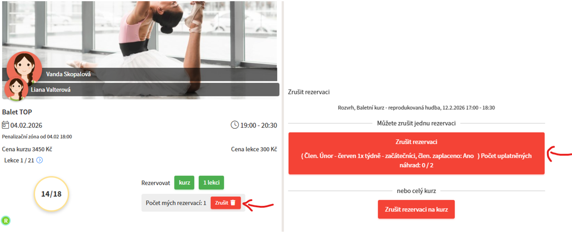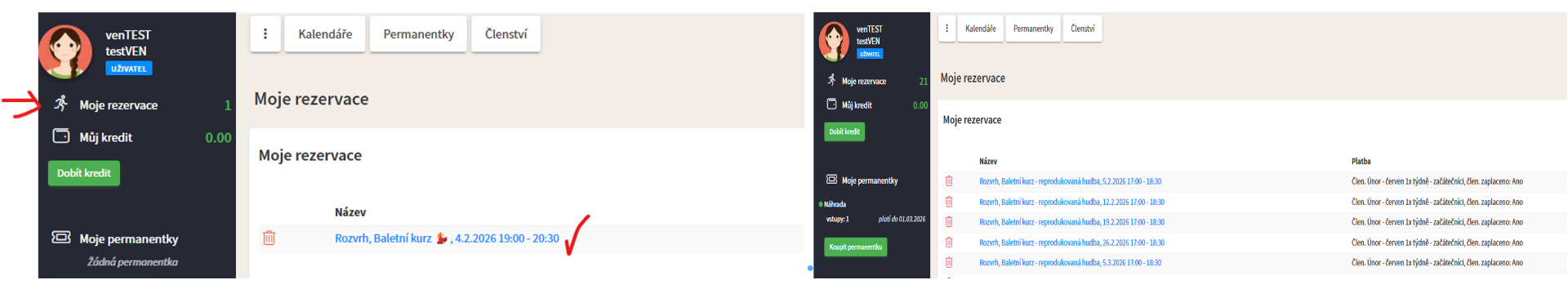 Dvěma způsoby: v kalendáři (zelená fajka v rohu kurzu) nebo lekce jsou uvedeny v záložce " Moje rezervace"